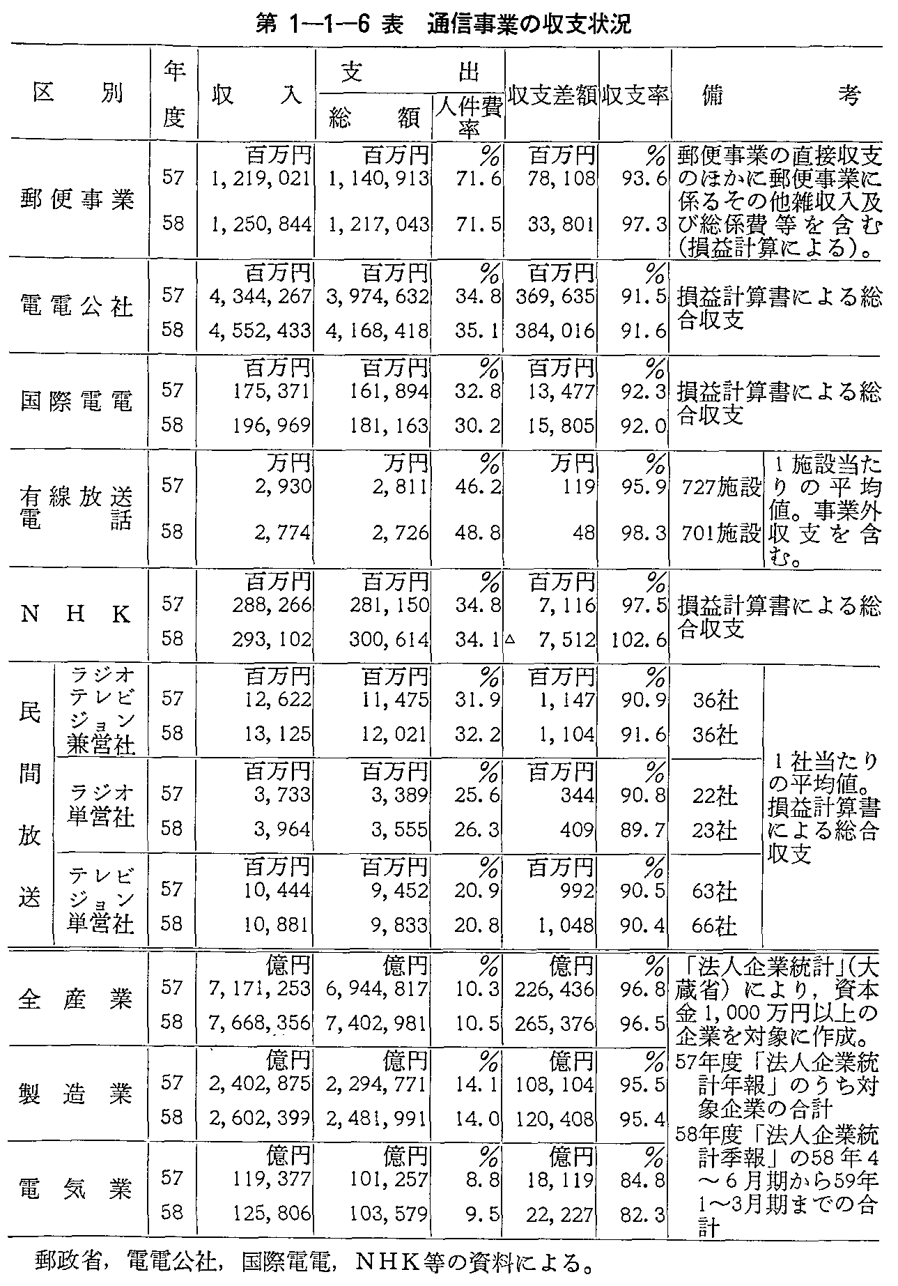 58年度における通信事業の収支状況は,緩やかながらも着実な景気回復を示した経済の動向を受けて,おおむね安定した推移をみた。