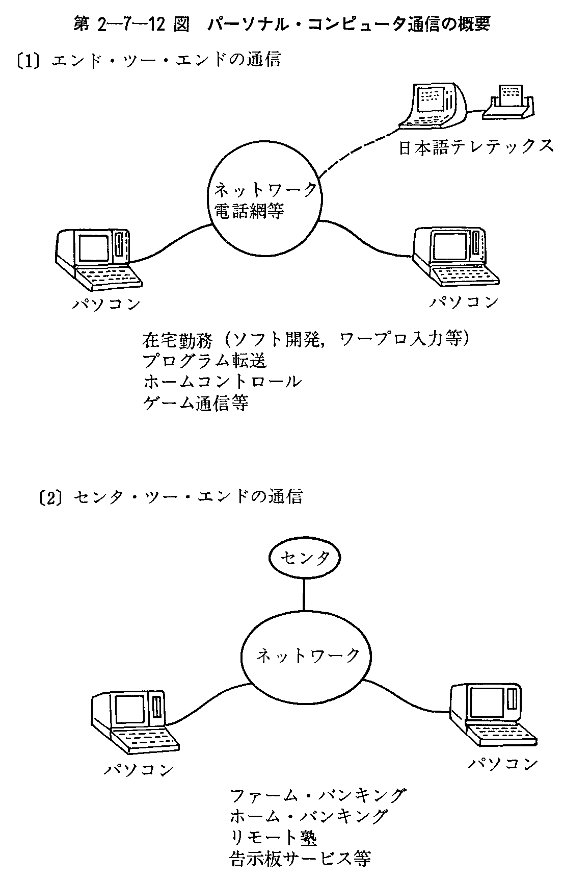 パーソナル・コンピュータは,これまでその多くが単体として使用されてきたが,最近では電気通信網を介して大型コンピュータに接続したり,パーソナル・コンピュータ相互で情報交換を行ったり,ビデオテックスのような端末に用いたりするような通信端末として利用しようとする動きがある(第2-7-12図参照)。