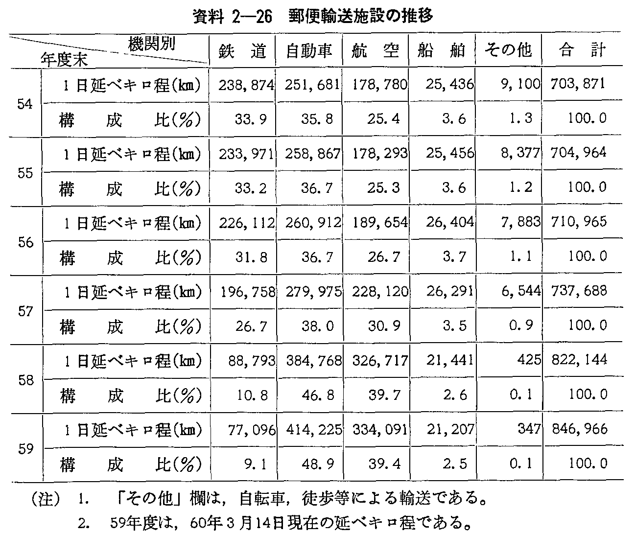 郵便輸送施設の推移をみると,58年度において,自動車輸送及び航空輸送が大幅に増加している。59年度においても自動車輸送が増加した。