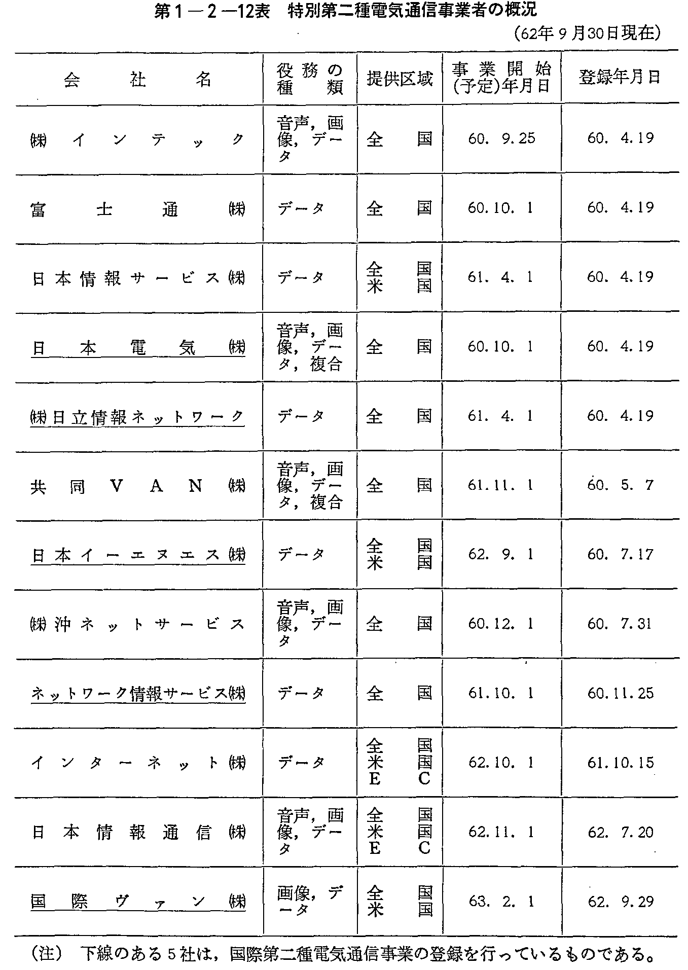 第一種電気通信事業者から回線設備を借りてサービスを行う第二種電気通信事業分野においても,多数の企業が参入している。62年9月30日現在,特別第二種電気通信事業を行うことについて登録を受けたものが