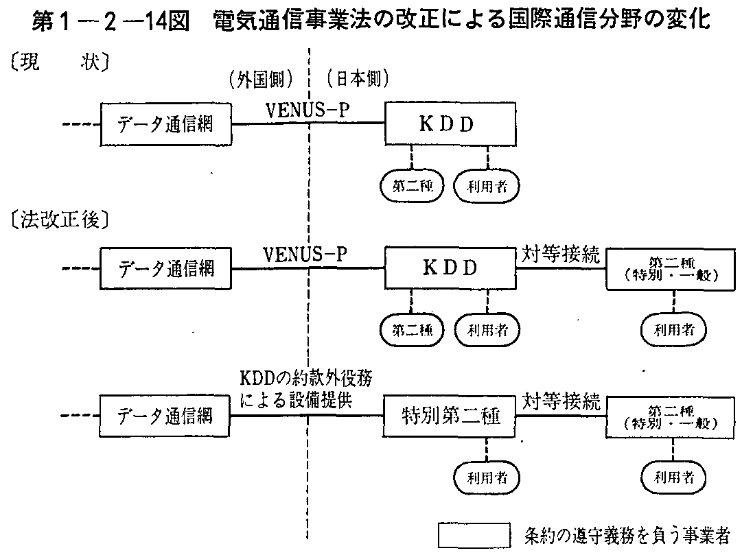 国際電気通信分野では,従来,CCITTのD1勧告による国際専用回線の利用制限等もあって,第二種電気通信事業者がネットワーク構築上の柔軟性が高く,経済的にも有利な専用回線を利用して行う高度な国際電気通信事業は,実現していなかった。