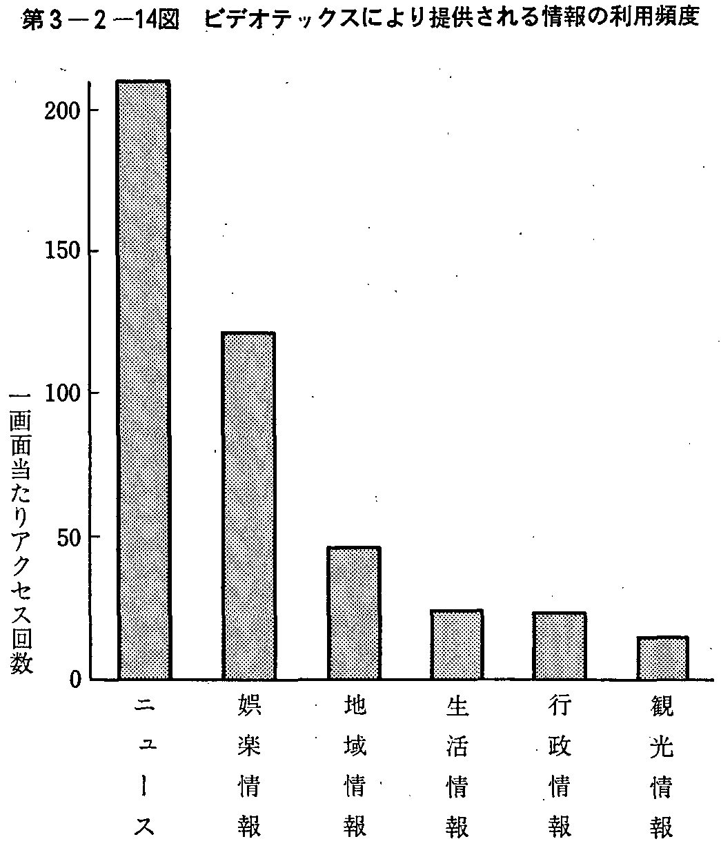 これを1画面当たりの月間アクセス回数でみると,ニュース(220回),娯楽情報(120回)に対する利用頻度が高く,逆に観光情報(15.2回),行政情報(22.9回)については蓄積画面数に比して利用は少ないことが分かる(第3-2-14図参照)。また,各システムの設置場所別の端末数では平均で,街頭用約40端末,家庭用約300端末,企業用約160端末となっており,これらのことから,ビデオテックスによる情報通信システムは,地域の一般家庭に対するニュース,娯楽情報の提供に効果を挙げているといえよう。