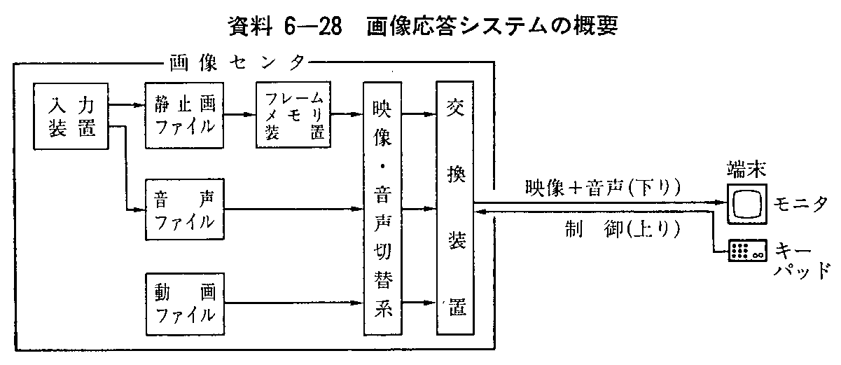 画像応答システム(VRS)は,プッシュホン又はキーボードから画像センタを呼び出し,広帯域ケーブルを介してセンタに蓄積されている各種情報を音声付カラー静止画又は動画でテレビジョン受像機に映し出す画像情報システムである。