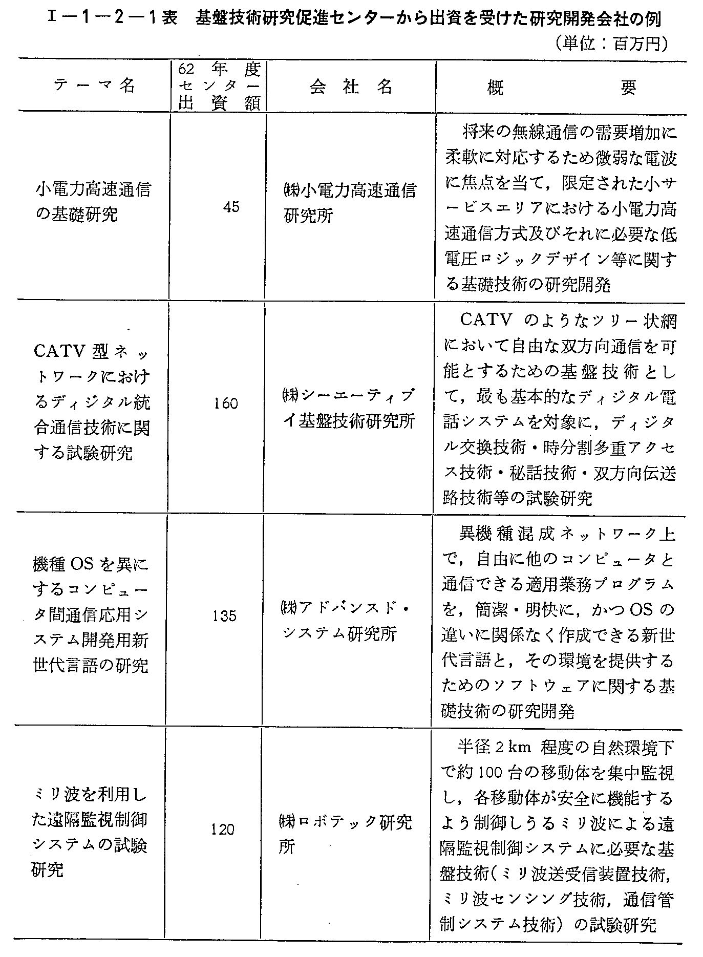 62年度における新規採択案件に対する出資は,15件10億4千万円と決定された。このうち電気通信関係の新規採択案件は,小電力高速通信,CATV型ネットワークにおけるディジタル統合通信技術,機種OSを異にするコンピュータ間通信応用システム開発用新世代言語,ミリ波を利用した遠隔監視制御システムの各試験研究の4件のほか,4件のテレトピア推進法人の試験研究等8件5億2千万円と報道発表された(<1>-1-2-1表参照)。