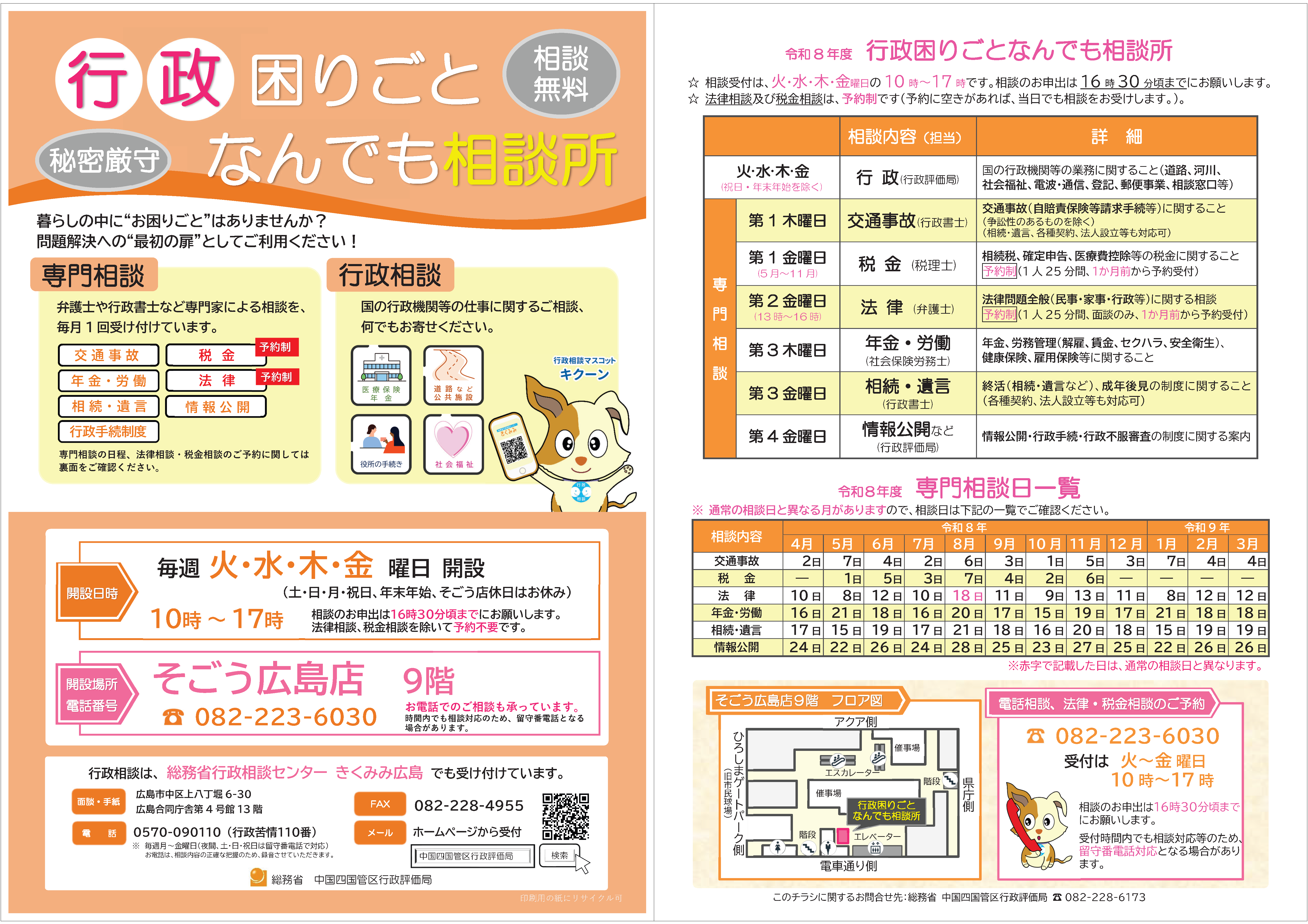 そごう広島店9階(広島市中区基町6−27)にある「行政困りごとなんでも相談所」は、お買い物ついでやバスの待ちの時間などに、お気軽に相談していただくために開設しています。