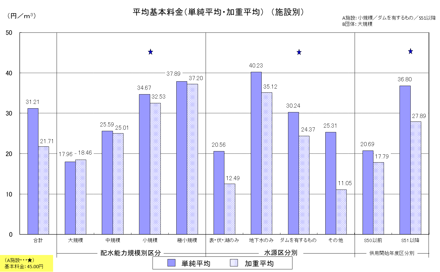 規模別・水源別平均基本料金(単純平均・加重平均)(施設別)