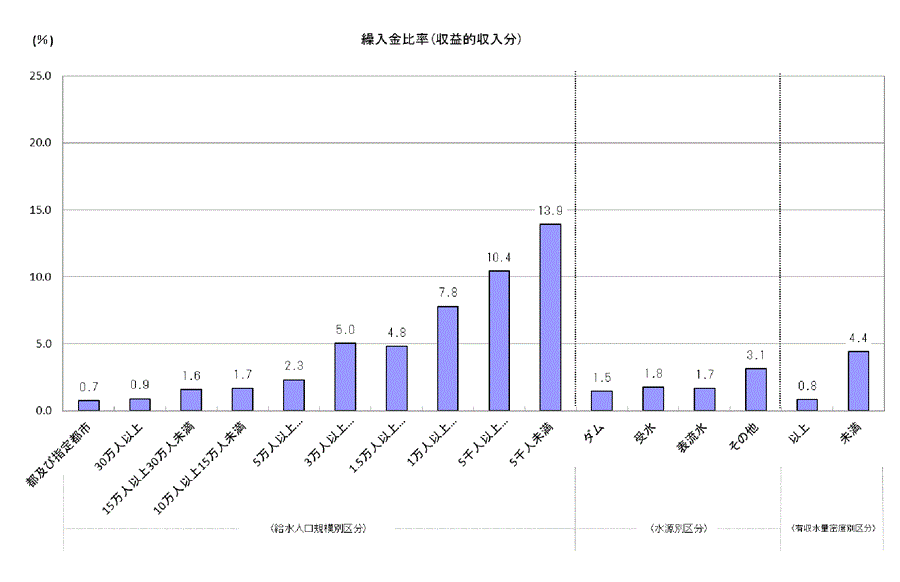 繰入金比率について、収益的収入分、資本的収入分ともに、給水人口規模の小さい事業ほど概ね高くなる傾向を示している。また、有収水量密度別区分では、平均未満の団体の繰入金比率が収益的収入、資本的収入ともに高くなっている。