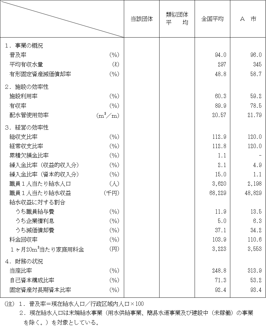 A市は、現在給水人口41,756人で、ダムを主な水源としており、有収水量密度0.77千m3/haで、本書における分類では、給水人口3万人以上5万人未満、水源別区分はダム、有収水量密度は全国平均以上の類型(類型区分a5)に属する。