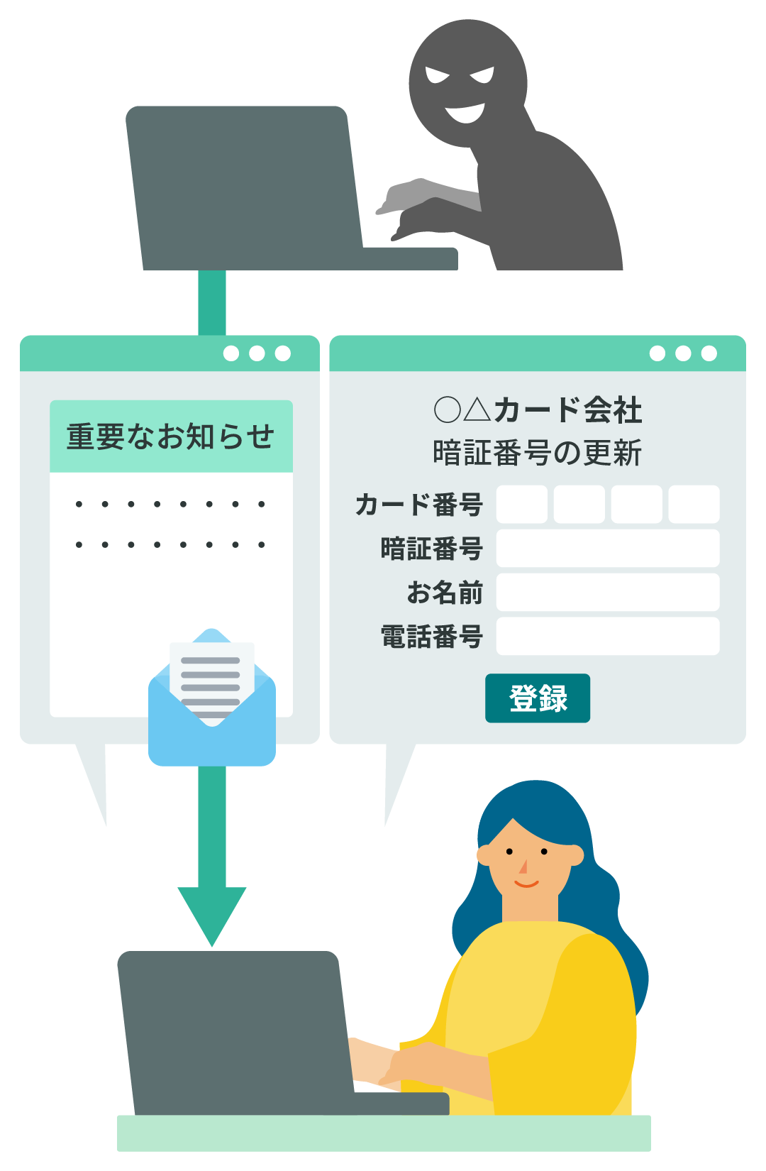 この電子メールを受け取ったOさんは、早速メールに記載されたURLをクリックして、表示されたホームページで、自分の名前、クレジットカード番号、新しい暗証番号を登録しました。
