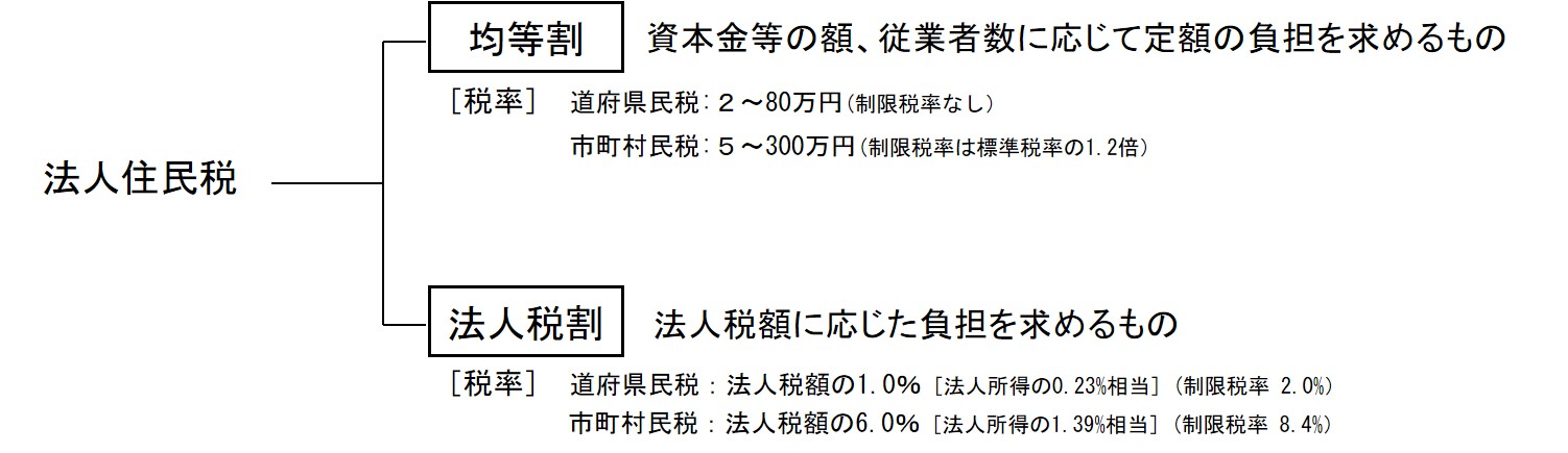 資本金等の額、従業者数に応じて定額が課される均等割、法人税額に応じて課される法人税割があります。