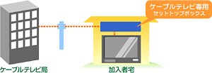トランスモジュレーション方式とは、ケーブルテレビで受信した電波をケーブルテレビに適した信号に変えて伝送する方式です。 この方式では、ケーブルテレビ専用のSTB(セットトップボックス)が必要になります。