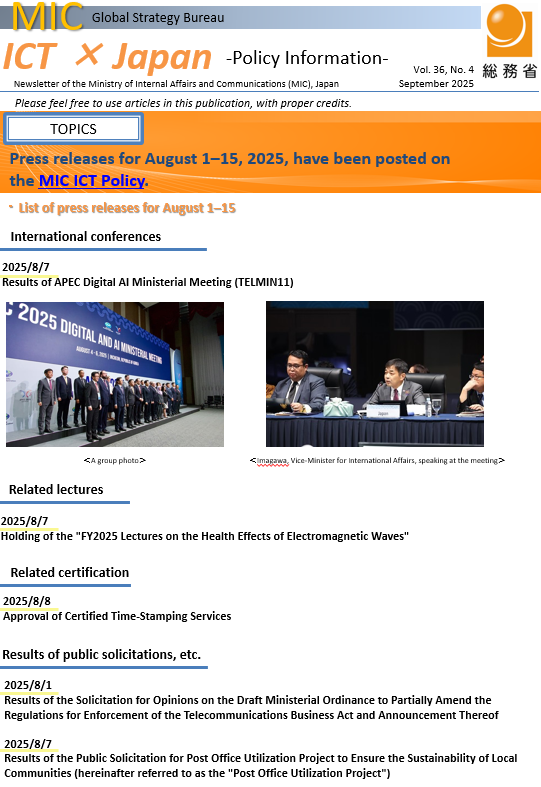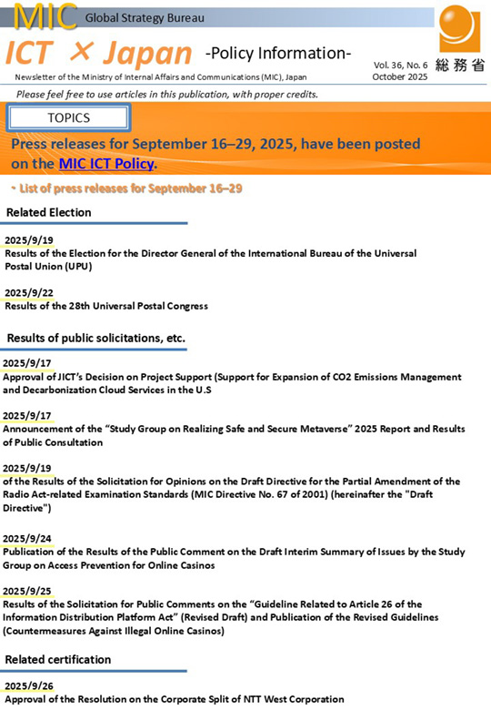 Measures and policies, reports from study groups, statistical data, results of international conferences and similar information in the field of Information, Communication and Global ICT infrastructure development, including press releases, concerning Ministry of Internal Affairs and Communications (MIC) are delivered through e-mail and published on this page.