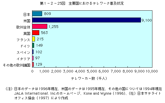 世界に先駆けて1980年代後半からテレワークが普及し始めた米国では、1995年時点で910万人の労働者がテレワークを実践していると見られている(第1−2−25図参照)。