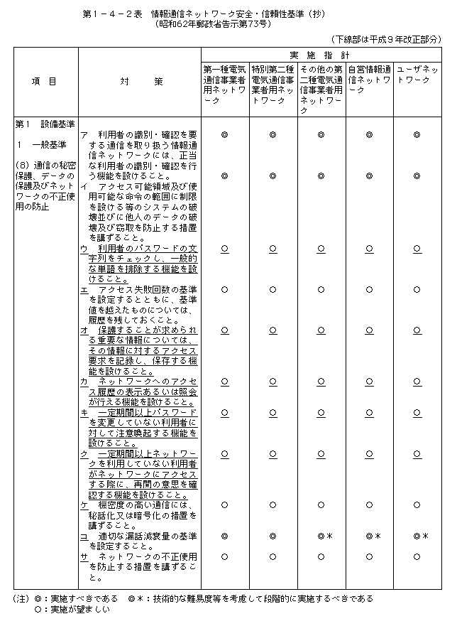 近年のインターネットの普及により生じている諸問題については、セキュリティ意識を啓もうするため、ネットワーク提供者、利用者のそれぞれが講ずべき対策を行政がガイドラインを作成し勧告している。郵政省では9年7月に、「情報通信ネットワーク安全・信頼性基準」(郵政省告示)を改定し、パスワード管理、アクセス管理、アクセス履歴の保存等無権限アクセス防止対策を新たに規定した(第1−4−2表参照)。