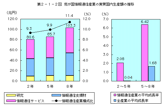 我が国の情報通信産業の実質国内生産額は、8年には100兆円を突破して103.3兆円(全産業に占めるシェアは11.4%)となった。また、5年から8年の間の年平均成長率は6.42%と、同期間の全産業の年平均成長率(1.68%)を大きく上回っている(第2−1−2図参照)。