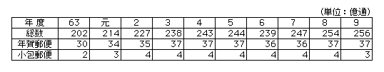 9年度の国際郵便物数は、4億3,994万通(個)(同2.3%増)である。