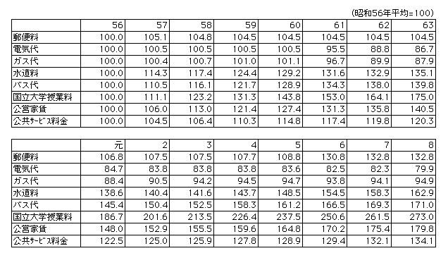 郵便料金について、「消費者物価指数年報」(総務庁)における価格指数を用いて、昭和56年を100とした指数を他の公共料金と比較すると、5年までは公共料金サービスの平均より低く推移していたが、6年の料金改定を経て、8年ではおおむね公共料金サービスの平均に位置している(第2−4−15図参照)。