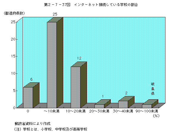 一方、インターネットが接続できる小中学校、高等学校の割合は岐阜県が98.0%と進んでいるが、それ以外の都道府県は50%以下である(第2−7−37図参照)。
