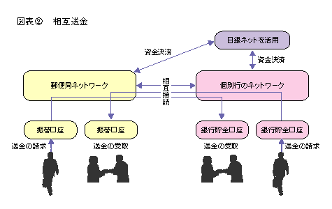 郵便局・民間金融機関間の送金について、簡便な手続による送金を可能にするため、郵便局と民間金融機関の送金ネットワークを相互接続することとしている。送金には、郵便局の郵便振替口座と銀行預金口座を使用し、システムの改造後、11年度からサービスを実施する予定である。