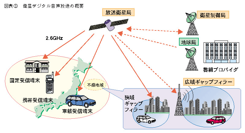 衛星デジタル音声放送は、衛星からの電波を主とし、衛星からの電波が遮断されるエリアをカバーするための補助的な地上無線設備(ギャップフィラー)を活用することで、日本全国均一なサービスの提供を可能にするものである(図表1))。
