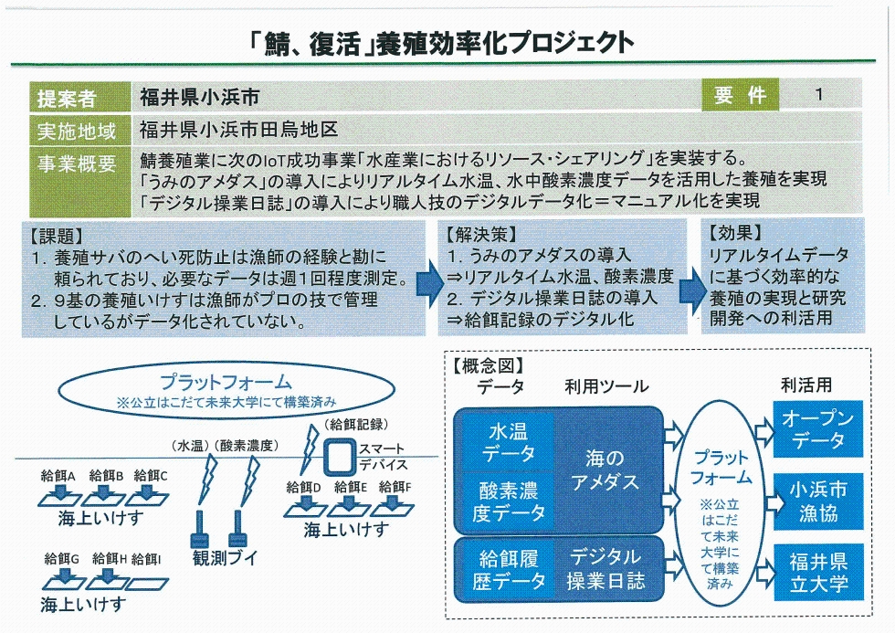 | 事業概要 | 鯖養殖業に次のIoT成功事業「水産業におけるリソース・シェアリング」を実装する。 「うみのアメダス」の導入によりリアルタイム水温、水中酸素濃度データを活用した養殖を実現。 「デジタル操業日誌」の導入により職人技のデジタルデータ化=マニュアル化を実現。 |
