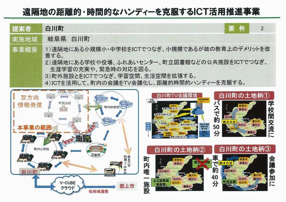 | 事業概要 | 1)遠隔地にある小規模小・中学校をICTでつなぎ、小規模であるが故の教育上のデメリットを改善する。 2)遠隔地にある学校や役場、ふれあいセンター、町立図書館などの公共施設をICTでつなぎ、生涯学習の充実や、緊急時の対応を図る。 3)町外施設とをICTでつなぎ、学習空間、生活空間を拡張する。 4)ICTを活用して、町内の会議をTV会議化し、距離的時間的ハンディーを克服する |