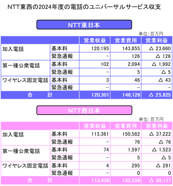 電話のユニバーサルサービス制度の発動には、その前年度のNTT東西のユニバーサルサービス収支に赤字が発生することが条件です。 2024年度の収支は、図のように、NTT東日本が約258億円の赤字、NTT西日本が約391億円の赤字となったため、電話のユニバーサルサービス制度に基づき、補填がなされることになります。 なお、補填額は、赤字額を超えないことが法令で定められています。