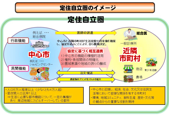 市町村の主体的取組として、「中心市」の都市機能と「近隣市町村」の農林水産業、自然環境、歴史、文化など、それぞれの魅力を活用して、NPOや企業といった民間の担い手を含め、相互に役割分担し、連携・協力することにより、地域住民のいのちと暮らしを守るため圏域全体で必要な生活機能を確保し、地方圏への人口定住を促進する取組です。