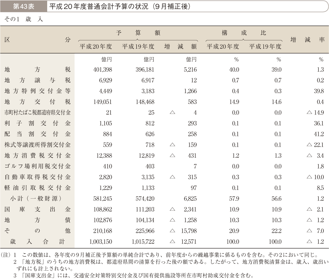 平成20年度の地方公共団体の普通会計予算(9月補正後)の状況は、第43表のとおりであり、普通会計予算の総額(都道府県及び市町村の単純合計)は、前年度と比べると1.2%減となった。