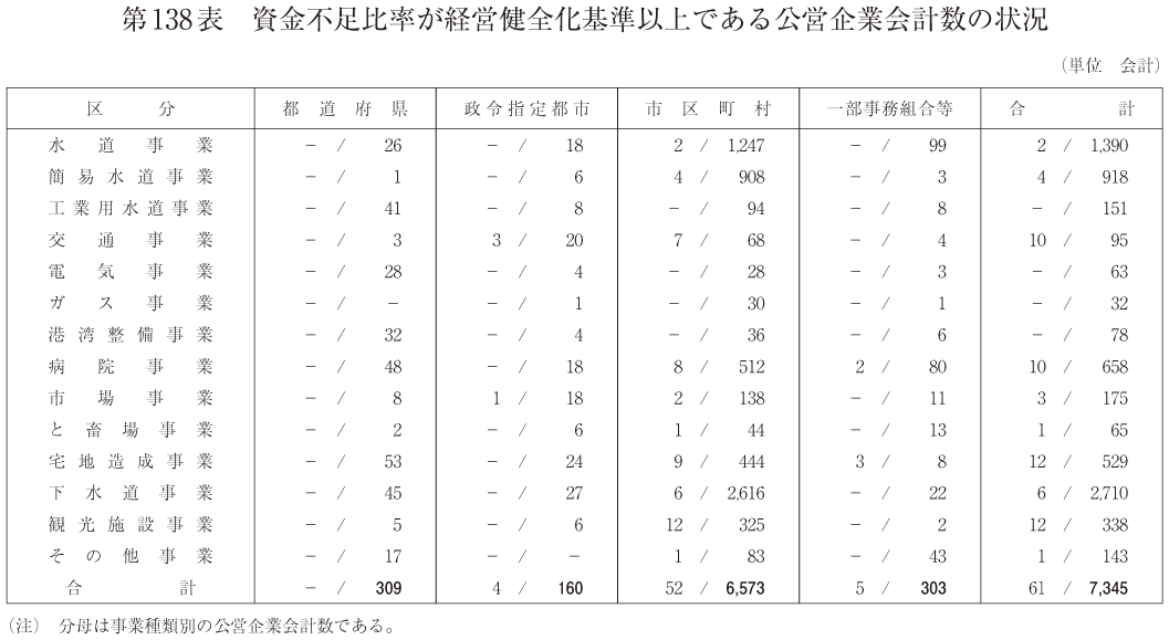 第138表 資金不足比率が経営健全化基準以上である公営企業会計数の状況 [Excel]