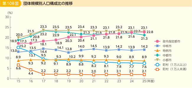 また、団体規模別の人口構成比の推移をみると、第108図のとおりである。団体数の割合と同様に、市については団体規模の移動があるものの、全体として上昇している一方、町村については低下しており、平成26年1月1日現在では、政令指定都市が22.8%(前年度末22.7%)、中核市が14.2%(同13.9%)、特例市が8.9%(同8.9%)、中都市が21.3%(同21.6%)、小都市が23.1%(同23.1%)、人口1万人以上の町村が7.6%(同7.7%)、人口1万人未満の町村が2.1%(同2.1%)となっている。