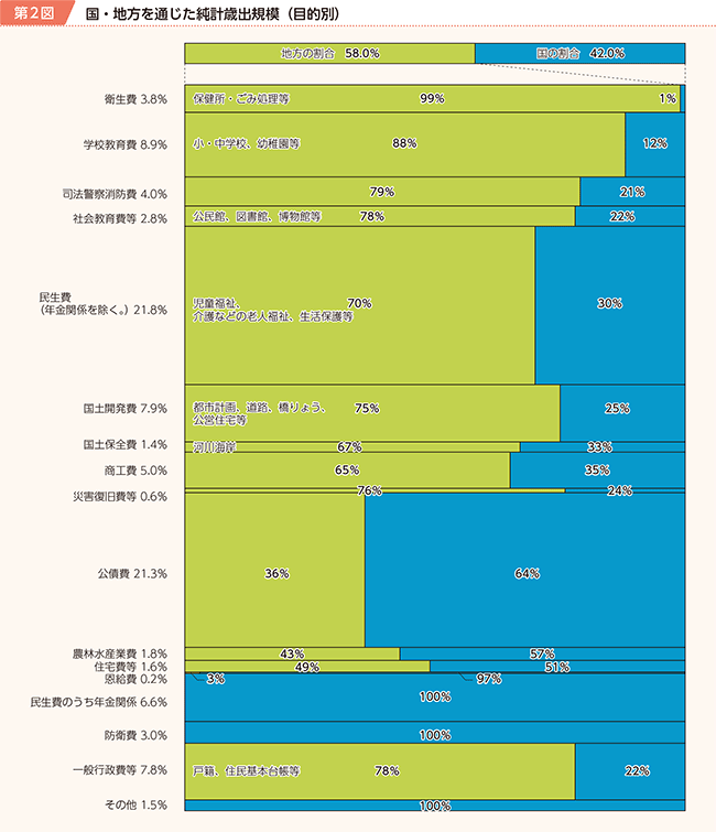 また、歳出純計額の目的別歳出額について更に詳細に国と地方に分けて示したものが第2図である。これによると、防衛費等のように国のみが行う行政に係るものは別として、民生費、衛生費、学校教育費等、国民生活に直接関連する経費については、最終的に地方公共団体を通じて支出される割合が高いことが分かる。これを地方公共団体において実施されている具体的な行政事務でみると以下のとおりである。
