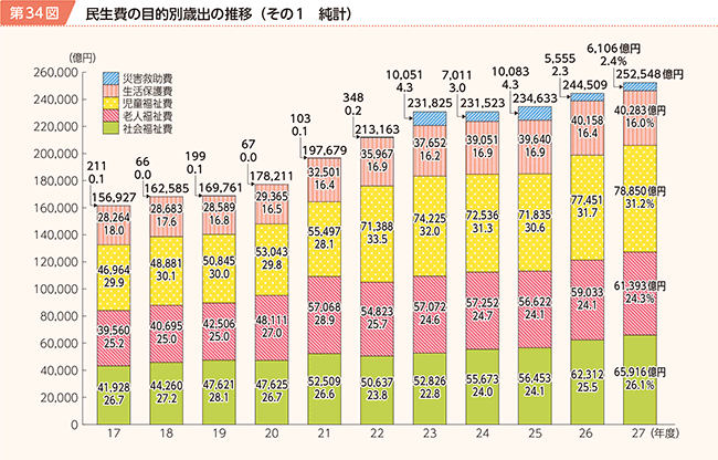 これらの諸施策に要する経費である民生費の決算額は25兆2,548億円で、前年度と比べると3.3%増となっている。