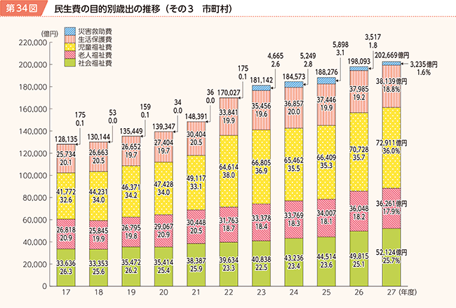 また、市町村においては児童福祉費の構成比(36.0%)が最も大きく、以下、社会福祉費(25.7%)、生活保護費(18.8%)、老人福祉費(17.9%)、災害救助費(1.6%)の順となっている。