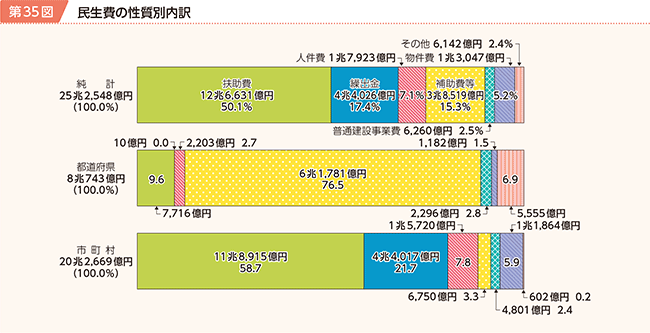 民生費の性質別の内訳をみると、第35図のとおりであり、児童手当の支給や生活保護に要する経費等の扶助費が最も大きな割合(民生費総額の50.1%)を占め、以下、国民健康保険事業会計(事業勘定)、介護保険事業会計、後期高齢者医療事業会計等に対する繰出金(同17.4%)、補助費等(同15.3%)、人件費(同7.1%)、物件費(同5.2%)、普通建設事業費(同2.5%)の順となっている。