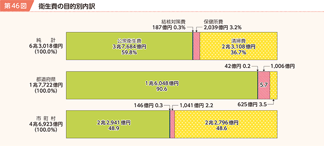 衛生費の目的別の内訳をみると、第46図のとおりであり、保健衛生、精神衛生及び母子衛生等に要する経費である公衆衛生費が最も大きな割合(衛生費総額の59.8%)を占め、次いで一般廃棄物等の収集処理等に要する経費である清掃費(同36.7%)となっている。これらの経費を合わせると、衛生費全体の96.5%を占める。