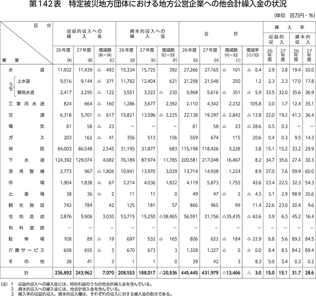 第142表 特定被災地方団体における地方公営企業への他会計繰入金の状況