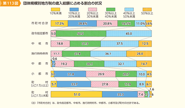 地方税の構成比の高い順にみると、施行時特例市(42.6%)、政令指定都市(40.2%)、中核市(39.2%)、中都市(37.5%)、小都市(26.2%)、人口1万人以上の町村(24.7%)、人口1万人未満の町村(12.6%)となっており、総じて規模が大きいほど地方税の歳入総額に占める割合が高くなっている。