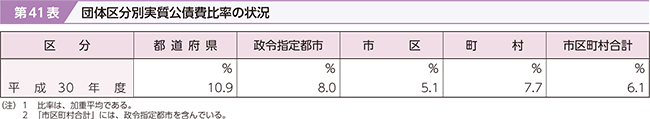 団体区分別の実質公債費比率の状況は、第41表のとおりであり、実質公債費比率の平均は、都道府県10.9%、政令指定都市8.0%、市区5.1%、町村7.7%となっている。
