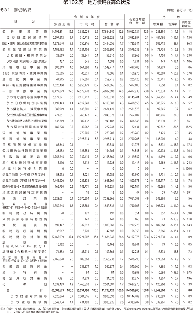 第102表 地方債現在高の状況
