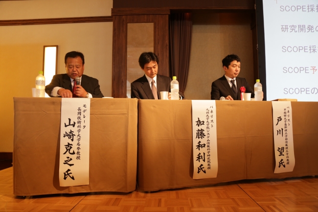フォーラムでは、「ICT重点技術の研究開発」及び「戦略的情報通信研究開発推進事業(SCOPE)」において、平成29年度に終了した44件の研究開発課題の成果発表が行われました。併せて、株式会社Z-Works 代表取締役 小川誠氏による基調講演「大企業とのオープンイノベーション 〜自らの持つ技術・強みをいかに他者のアセットと組み合わせるか〜」や、長岡技術科学大学 名誉教授 山崎克之氏をモデレータにお迎えしてSCOPE採択経験者によるパネルディスカッション「SCOPEの有効活用について」を実施しました。また、総務省の研究開発施策についての紹介も行いました。