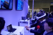 人材育成に対応したバーチャルトレーニングシステムを実際に体験する古川総務大臣政務官