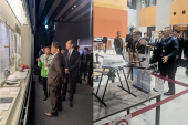 福島ロボットテストフィールドでロボットを視察する林総務大臣(右)