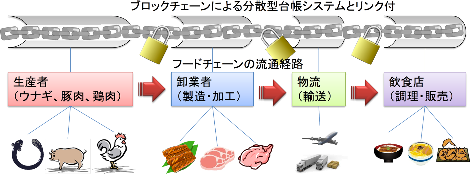 | 事業概要 | 飲食店における食材の産地履歴追跡において、ブロックチェーン技術を利用した改竄不可能なトレースシステムを構築し、ウナギ、豚肉、鶏肉の食材に限定したフードチェーン各主体における社会実装実験を行う。 |