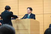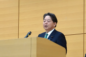 新規採用職員に訓示を述べる林総務大臣