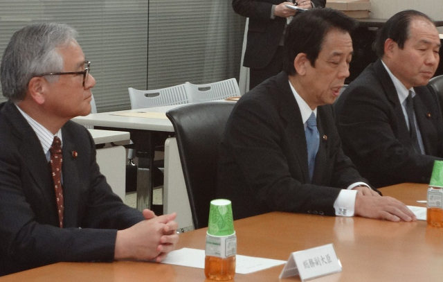 挨拶をする川端総務大臣(中央)、黄川田副大臣(左)、福田政務官(右)