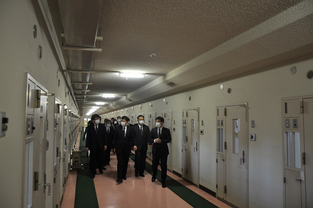府中刑務所で、受刑者の居室(単独室)を視察する新藤総務大臣と谷垣法務大臣※受刑者のインフルエンザ対策のため、所内では、現在、マスクを着用することとされています。