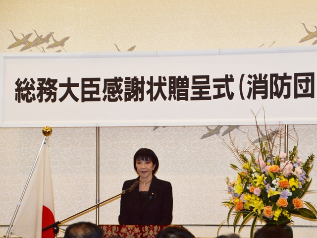 平成28年12月20日、高市総務大臣、原田総務副大臣は、本年4月に発生した熊本地震で活躍した消防団、団員を多く確保した消防団に対する総務大臣感謝状贈呈式(消防団関係)に出席しました。