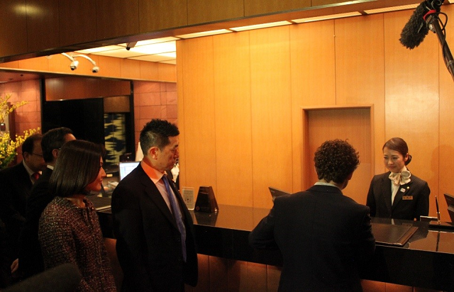 ホテルでのスムーズなチェックインを視察するあかま総務副大臣と金子総務大臣政務官