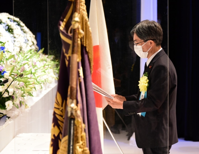 岸田内閣総理大臣に続いて、寺田総務大臣が追悼のことばを述べて献花を行いました。